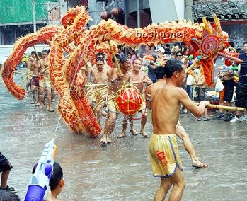 如今已發(fā)展成為對(duì)喜慶節(jié)日的慶祝,對(duì)美好生活祝福的一種方式。它用鮮棕葉作龍須,用葛藤、黃荊條、松樹枝作龍身,分9節(jié)、11節(jié)、1 3節(jié)、15節(jié)等不同長(zhǎng)度的奇數(shù),由9至15人參加舞龍。伴著鑼、鼓、鎖吶的鏗鏘樂曲,一人持“寶”在前,龍舞歡騰時(shí)有“二龍搶寶”、“蛇蛻皮”、“烏龍絞柱”等50多種動(dòng)作玩法。與此同時(shí),身著民族服裝的群眾用臉盆、水瓢、銻桶等容器端水圍繞著龍潑澆,這樣邊舞邊潑水、水潑得越多龍舞得越歡,也預(yù)祝大家當(dāng)年風(fēng)調(diào)雨順,五谷豐登,其場(chǎng)面歡樂喜慶,風(fēng)趣幽默。已列入我市第一批非物質(zhì)文化遺產(chǎn)保護(hù)名錄。