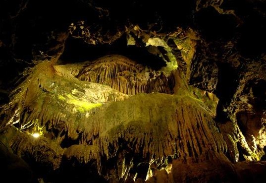 兜率巖位于資興市東江水庫(kù)中的一座島嶼上,峭壁臨水,山腰有所廟宇,叫“兜率庵”,庵的后面便是兜率巖洞。兜率巖洞長(zhǎng)5公里多,內(nèi)有銅鐘洞、鑼鼓洞、彩石洞等,可謂洞中有洞。期間鐘乳倒垂,天然物象。洞底許多晶瑩透明的細(xì)石,用燈光照射,光芒閃爍,宛若天河群星,璀璨奪目。