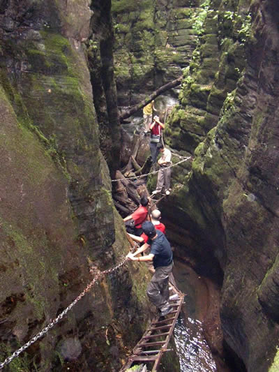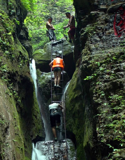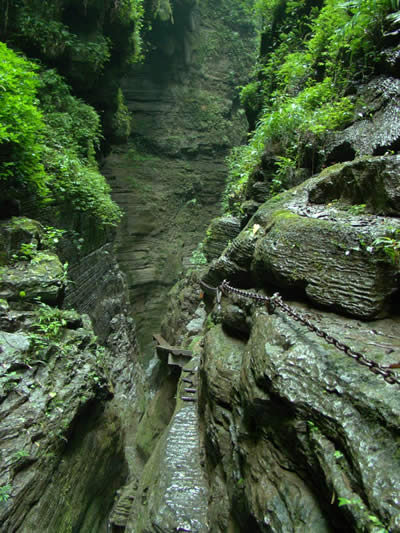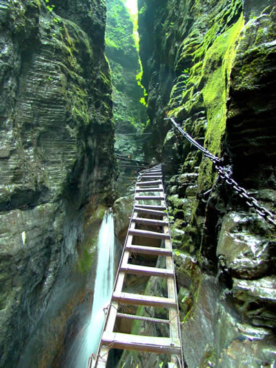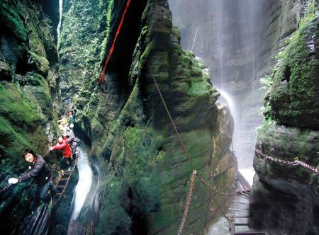 坐龍峽風景區(qū) 坐龍峽擁有中國第一條特種游道。所有游道均建于峽谷深處,依山取勢,既經(jīng)細心雕琢聽卻又渾然天成。粗樸的板栗木棧道,可以讓你零距離的親近那一潭碧幽、聽聞山泉叮咚;精巧的跳墩,可以讓你媳戲流泉、觸感溪瀑;原質(zhì)的石坎道,讓你不得不調(diào)動全部的身心能量悉心攀援、感悟峽谷;有驚無險的鐵梯,讓你伴著腳下轟鳴的溪水,在驚怵中體味一份快慰。出口處的土家山寨,保留了古樸獨特的生活習俗。一塊臘肉就一口醇香的“苞谷燒”會讓你洗去所有的疲憊,在輕松中憨厚的主人向你講述過去強人出沒的故事......
