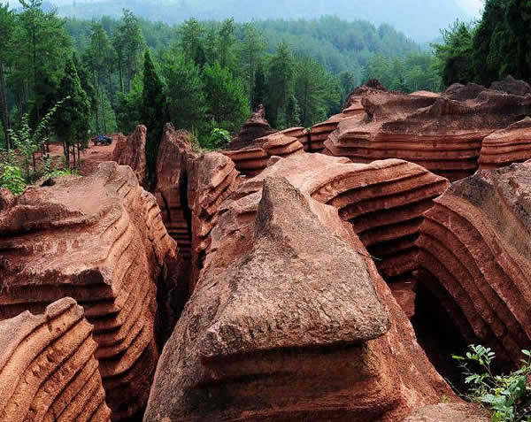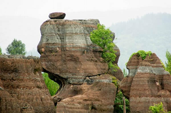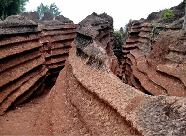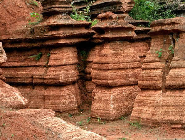 紅石林 告別船工后一切便突然安靜下來,過山谷的小路沒有人家,偶爾傳來幾聲清脆的鳥叫。穿過幾座隘口,峰回路轉(zhuǎn)后“石林”漸漸露臉,石頭的顏色是由灰白到棕紅,變幻而又使人聯(lián)想。間或一棵參天大樹,或是綠竹三兩棵,則又是另一番景致了。于高于低、于肥于瘦的石林,于石于樹、于濃于淡的色彩,顯得雄奇又雋秀,并透露出一種清靈飄逸。 這些石柱不但顏色各異,而且大小不等。有的高達(dá)七、八米,而有些則像半埋于地下的巨獸骨架。一位村民告訴記者,現(xiàn)在石林沒有以前壯觀,都長渣子(灌木)了。原因是由于山頂樹木減少,雨水將泥土帶下山,很多石頭都被埋在土下,后來這些地方都開墾了農(nóng)田,石林也被永久覆蓋。 由于泥土覆蓋,石林被切割成一個個小區(qū)域,有些隱蔽在果林中,而有些則像突然從天而降,散落田間。