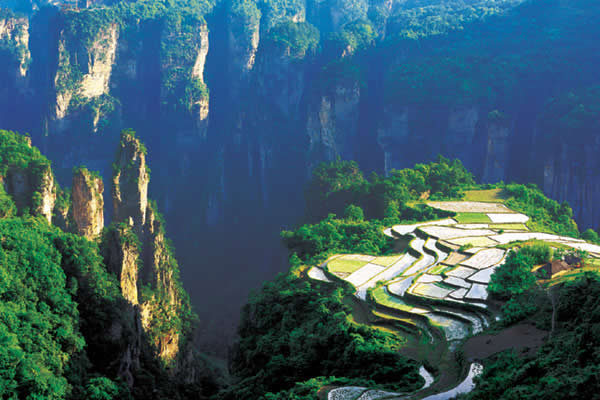 空中田園坐落在天子山莊右側經老虎口、情人路方向兩公里處的土家寨旁,海拔1000余米。它的下面是萬丈深淵的幽 谷,幽谷上有高達數百米的懸崖峭壁,峭壁上端是一塊有3公頃大的斜坡梯形良田。田園三方峰巒疊翠,林木參天,白云繚繞,活像一幅氣勢磅礴的山水畫。登上“空中田園”。清風拂袖,云霧裹身,如臨仙境,使人有青峰鳴翠鳥,高山響流泉,身在田園里,如上彩云間”之感。