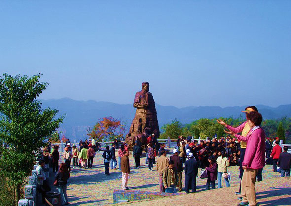 在茶盤塔的西南側,有一座海拔1200多米高 的山峰,這就是“天子峰”。天子峰,看上去活象一位偉人,他坐在那里,身披鐵甲,右手握箭,濃眉隆起,兩眼怒視前方,似正要指揮千軍萬馬出征,大戰(zhàn)一場。這個形象就是人們傳說的向王天子,所以取名叫“天子峰”。 |