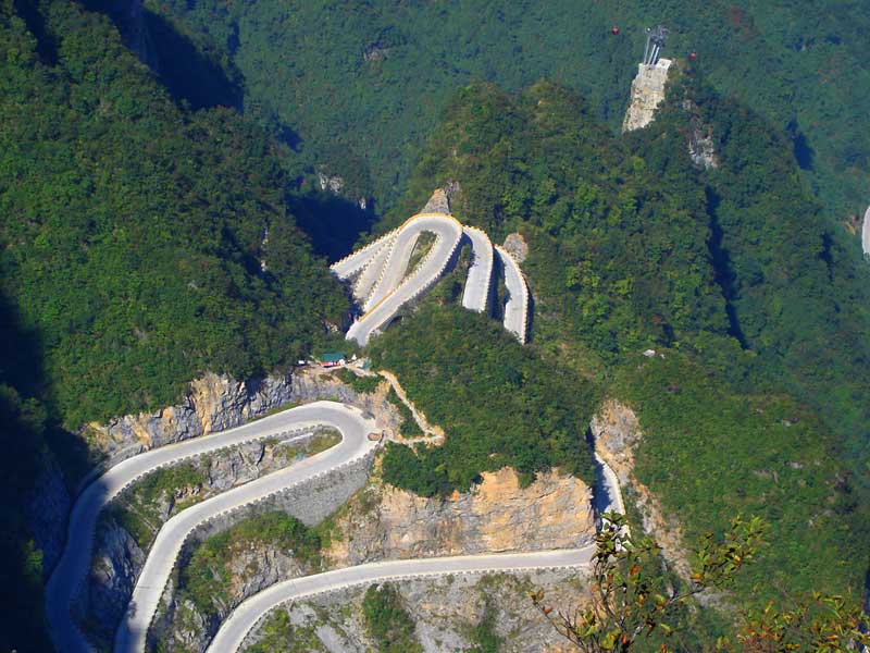 張家界天門山盤山公路有"通天大道"之稱,盤山公路全長(zhǎng)10.77公里,海拔從200米急劇提升到1300米,大道兩側(cè)絕壁千仞,空谷幽深,共計(jì)99個(gè)彎,180度急彎此消彼長(zhǎng),似玉帶環(huán)繞,彎彎緊連,層層迭起,被譽(yù)為“天下第一公路奇觀”。