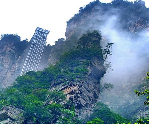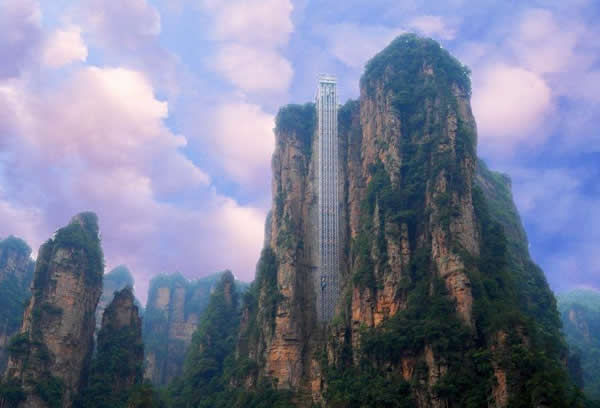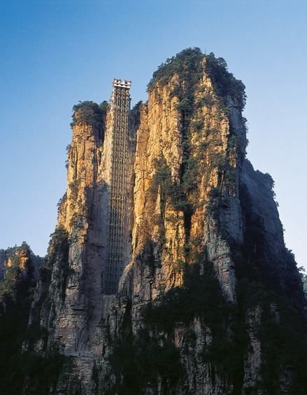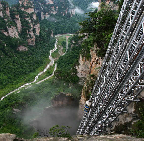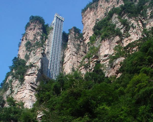 百龍電梯圖片 百龍?zhí)焯輾鈩莼趾辏怪备卟?35米,運行高度326米,由154米山體內(nèi)堅井和172米貼山鋼結(jié)構(gòu)井架等組成,采用三臺雙層全暴露觀光電梯并列分體運行,每臺次載客50人次,運行速度3米/秒,三臺同時運行每小時往返量達4000人次。百龍?zhí)焯莸男藿▽崿F(xiàn)“山上游,山下住”的目標,提供了交通保障,將袁家界天下第一橋、迷魂臺、天懸白練以及烏龍寨、楊家界等絕世美景從幕后推向了前臺,并將天子山、袁家界、金鞭溪等精品旅游線路連為一體,解決了多年困擾景區(qū)的交通瓶頸問題。