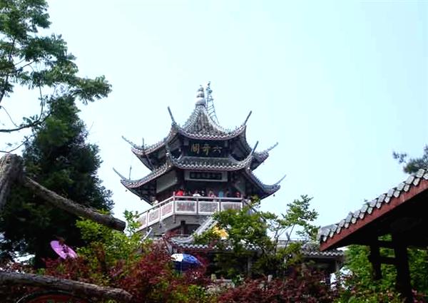 | 六奇閣位于張家界森林公園黃石寨項的人工建筑。因張家界國家森林公園”山奇、水奇、云奇、石奇.樹奇以及珍禽異獸之奇”而得名。閣分3層,黃瓦蓋頂,飛檐翹角,畫梁彩棟,回廊石欄。登閣憑眺,滿目佳景。閣柱楹聯(lián)日:“翠鬟煙籠,綠樹云封.昔日曾遮半個面:麗質(zhì)天生,畫圖省識,今朝始醉四方人。”又一聯(lián)云“名動全球,到此實堪三擊掌:勢拔五岳,歸來不用再看山!遍w內(nèi)設(shè)有土家風(fēng)情歌舞樓.竟日絲竹弦管,清音繞梁。閣基嵌有《張家界國家森林公園記》全文碑刻。1995年9月8日.全國政協(xié)主席李瑞環(huán)登閣賞景。