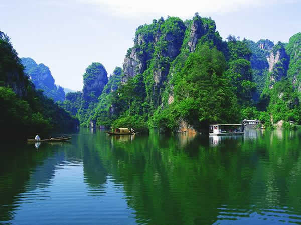 寶峰湖瀑布 湖中有兩座疊翠小島,近岸奇峰屹立,峰回水轉(zhuǎn)。泛舟漫游,只見一湖綠水半湖倒影,充滿詩情畫意!霸铺萑f丈上天臺(tái),高峽平湖一鑒開,王母瑤池金扶,浣沙仙女下凡來”游寶峰湖,你就會(huì)欣賞到這樣的詩情畫意。群峰擁抱的寶峰湖,長約2.,5公里,湖猶如一面寶鏡,四面青山,一泓碧水,蕩槳溫游,格外愜意。坐在船上,環(huán)顧四周,千山聳翠,俯視水中,倒影慢移,碧水照相館得群峰綠,人面桃花水映紅。真是靜極了,美極了!韓劇《九天洞》拍攝的湖水就是寶峰湖。