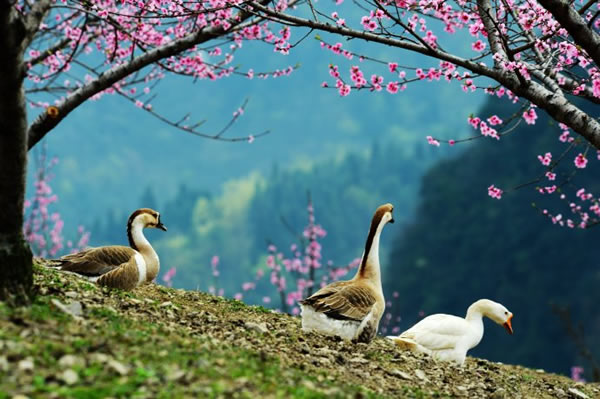 桃之夭夭,灼灼其華。據(jù)了解,天子山這處桃花仙境位于神堂灣至大觀臺(tái)之間的一農(nóng)場(chǎng)山丘內(nèi),面積足有一百畝以上。由于該地段剛好處于天子山至高點(diǎn),因此極目遠(yuǎn)眺,峰林風(fēng)光、桃花美景盡收眼底。而盡管農(nóng)場(chǎng),則是一派鄉(xiāng)村田園風(fēng)情,一群雞鴨鵝不時(shí)穿梭在桃樹(shù)林內(nèi),一邊尋覓食物,一邊享受春光;看家護(hù)院的小黃狗迎接游客的熱情叫聲,讓人頓生回歸鄉(xiāng)愁之感。